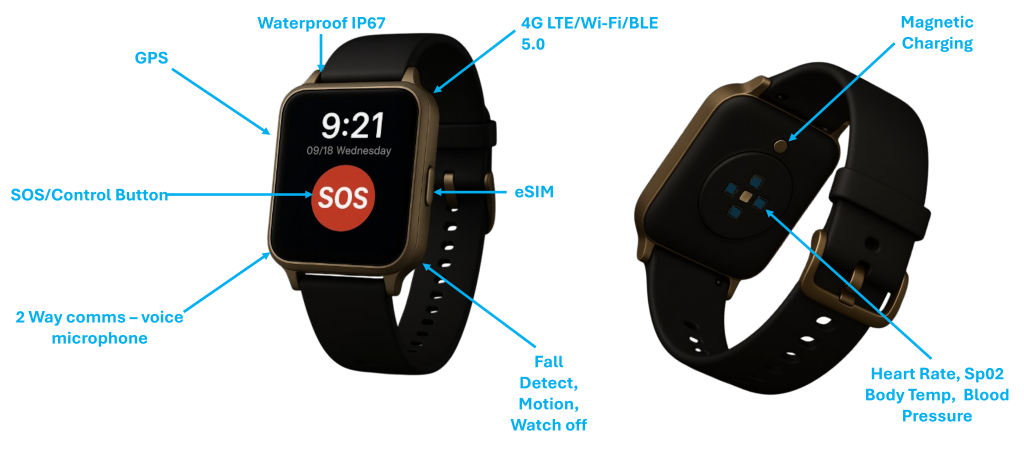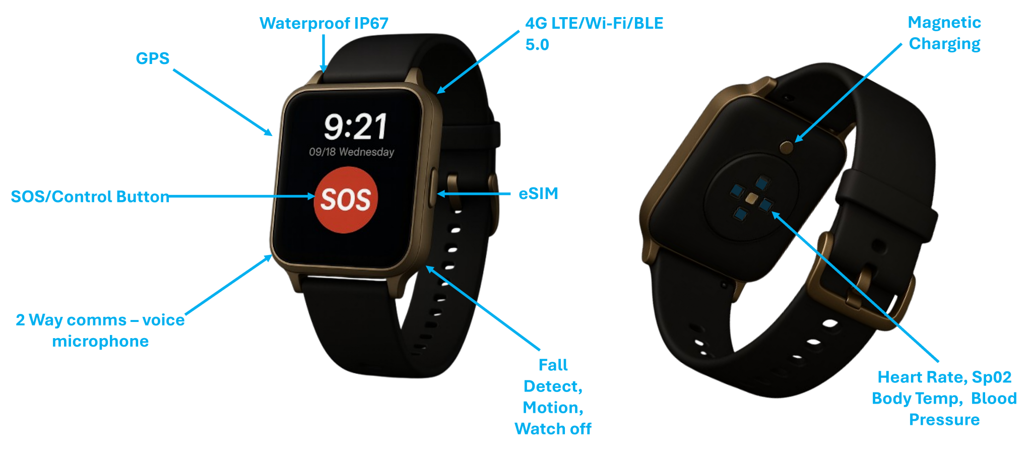 Powered by 4G LTE, Wi-Fi, Bluetooth 5.0, with 120 hours battery life and replaceable SIM/eSIM support, MBS Infinity Watch is IP67 waterproof and offers indoor and outdoor location tracking via GPS and WiFi, as well as 2-way voice communication, an SOS control button, emergency vibrate alerts (hearing impaired), magnetic charging (for ease), and a mobile app (iOS/Android) and web interface to track, locate, and display data, ensuring ongoing high-level medical care for its users.